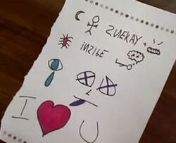 Charlie's book, which contains all his "dreams and aspirations" (which are mostly in pictures and symbols), entitled as "Dram bach" - this should represent "Dream book". (Charlie Kelly: King of the Rats)